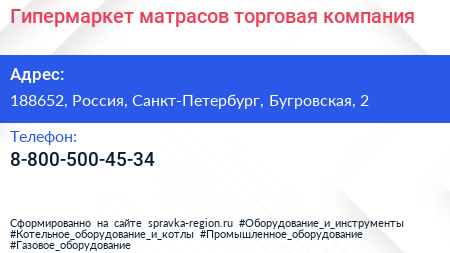 Гипермаркет матрасов, торговая компания по адресу 188652, Россия, Санкт-Петербург, Бугровская, 2 в дальнейшем Организация, размещена в следующих категориях:
