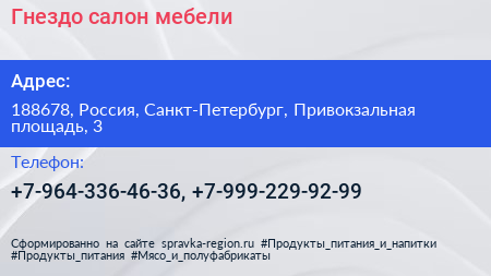 Гнездо, салон мебели по адресу 188678, Россия, Санкт-Петербург, Привокзальная площадь, 3 в дальнейшем Организация, размещена в следующих категориях: