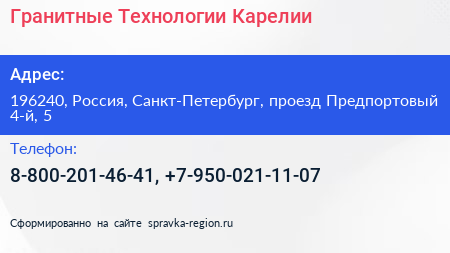 Гранитные Технологии Карелии по адресу 196240, Россия, Санкт-Петербург, проезд Предпортовый 4-й, 5 в дальнейшем Организация, размещена в следующих категориях: