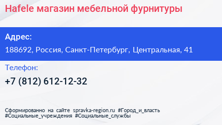 Hafele, магазин мебельной фурнитуры по адресу 188692, Россия, Санкт-Петербург, Центральная, 41 в дальнейшем Организация, размещена в следующих категориях: