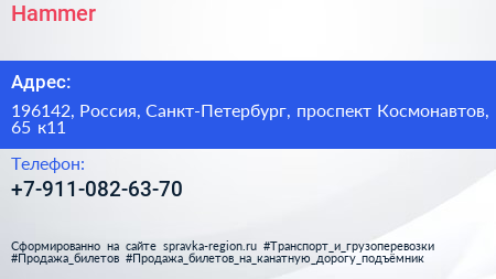 Hammer по адресу 196142, Россия, Санкт-Петербург, проспект Космонавтов, 65 к11 в дальнейшем Организация, размещена в следующих категориях: