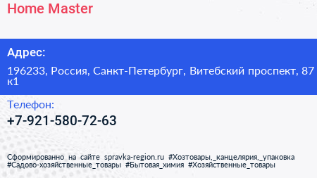 Home Master по адресу 196233, Россия, Санкт-Петербург, Витебский проспект, 87 к1 в дальнейшем Организация, размещена в следующих категориях: