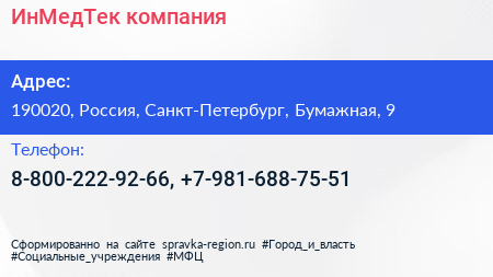 ИнМедТек, компания по адресу 190020, Россия, Санкт-Петербург, Бумажная, 9 в дальнейшем Организация, размещена в следующих категориях: