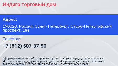 Индиго, торговый дом по адресу 190020, Россия, Санкт-Петербург, Старо-Петергофский проспект, 18е в дальнейшем Организация, размещена в следующих категориях: