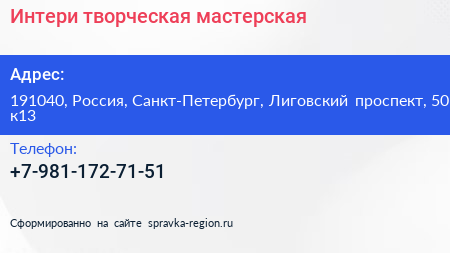 Интери, творческая мастерская по адресу 191040, Россия, Санкт-Петербург, Лиговский проспект, 50 к13 в дальнейшем Организация, размещена в следующих категориях: