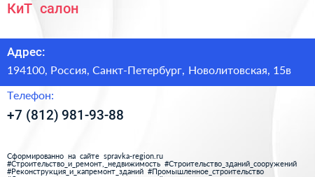 КиТ+, салон по адресу 194100, Россия, Санкт-Петербург, Новолитовская, 15в в дальнейшем Организация, размещена в следующих категориях: