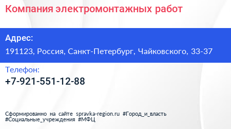 Компания электромонтажных работ по адресу 191123, Россия, Санкт-Петербург, Чайковского, 33-37 в дальнейшем Организация, размещена в следующих категориях: