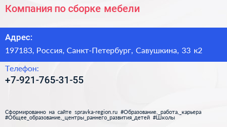 Компания по сборке мебели по адресу 197183, Россия, Санкт-Петербург, Савушкина, 33 к2 в дальнейшем Организация, размещена в следующих категориях: