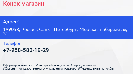 Конек, магазин по адресу 199058, Россия, Санкт-Петербург, Морская набережная, 31 в дальнейшем Организация, размещена в следующих категориях: