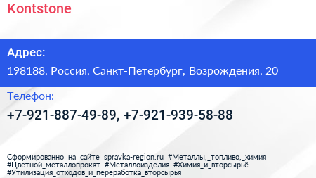Kontstone по адресу 198188, Россия, Санкт-Петербург, Возрождения, 20 в дальнейшем Организация, размещена в следующих категориях: