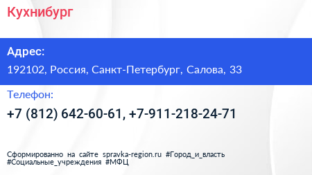 Кухнибург по адресу 192102, Россия, Санкт-Петербург, Салова, 33 в дальнейшем Организация, размещена в следующих категориях: