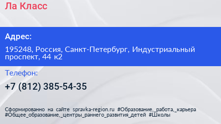 Ла Класс по адресу 195248, Россия, Санкт-Петербург, Индустриальный проспект, 44 к2 в дальнейшем Организация, размещена в следующих категориях: