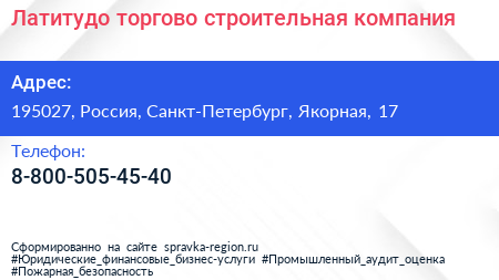 Латитудо, торгово-строительная компания по адресу 195027, Россия, Санкт-Петербург, Якорная, 17 в дальнейшем Организация, размещена в следующих категориях: