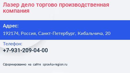 Лазер дело, торгово-производственная компания по адресу 192174, Россия, Санкт-Петербург, Кибальчича, 20 в дальнейшем Организация, размещена в следующих категориях: