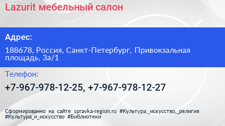 Lazurit, мебельный салон по адресу 188678, Россия, Санкт-Петербург, Привокзальная площадь, 3а/1 в дальнейшем Организация, размещена в следующих категориях: