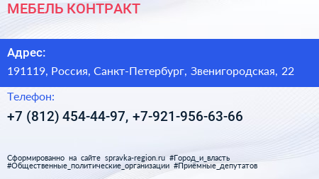МЕБЕЛЬ-КОНТРАКТ по адресу 191119, Россия, Санкт-Петербург, Звенигородская, 22 в дальнейшем Организация, размещена в следующих категориях: