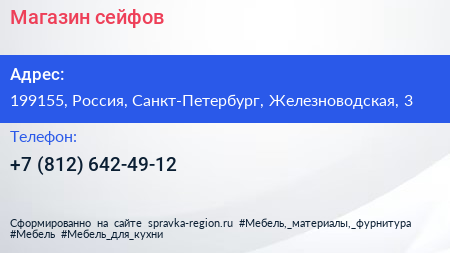Магазин сейфов по адресу 199155, Россия, Санкт-Петербург, Железноводская, 3 в дальнейшем Организация, размещена в следующих категориях: