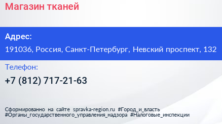 Магазин тканей по адресу 191036, Россия, Санкт-Петербург, Невский проспект, 132 в дальнейшем Организация, размещена в следующих категориях: