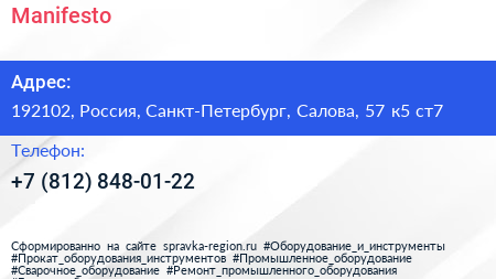 Manifesto по адресу 192102, Россия, Санкт-Петербург, Салова, 57 к5 ст7 в дальнейшем Организация, размещена в следующих категориях: