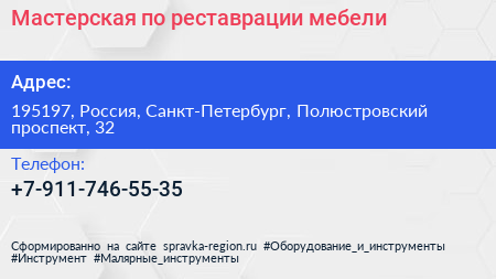 Мастерская по реставрации мебели по адресу 195197, Россия, Санкт-Петербург, Полюстровский проспект, 32 в дальнейшем Организация, размещена в следующих категориях: