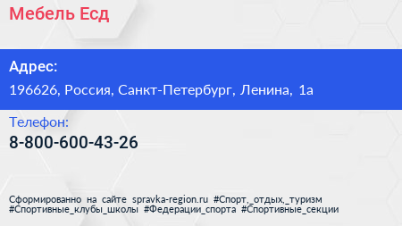 Мебель Есд по адресу 196626, Россия, Санкт-Петербург, Ленина, 1а в дальнейшем Организация, размещена в следующих категориях: