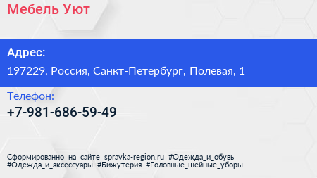 Мебель Уют по адресу 197229, Россия, Санкт-Петербург, Полевая, 1 в дальнейшем Организация, размещена в следующих категориях: