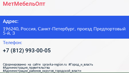МетМебельОпт по адресу 196240, Россия, Санкт-Петербург, проезд Предпортовый 5-й, 3 в дальнейшем Организация, размещена в следующих категориях: