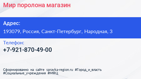 Мир поролона, магазин по адресу 193079, Россия, Санкт-Петербург, Народная, 3 в дальнейшем Организация, размещена в следующих категориях: