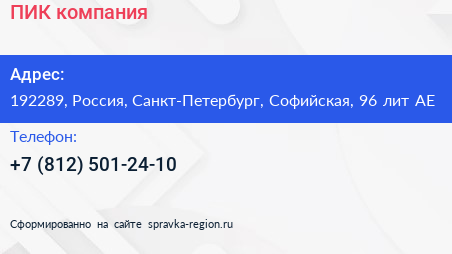 ПИК, компания по адресу 192289, Россия, Санкт-Петербург, Софийская, 96 лит АЕ в дальнейшем Организация, размещена в следующих категориях: