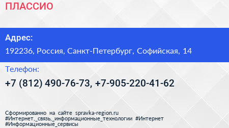 ПЛАССИО по адресу 192236, Россия, Санкт-Петербург, Софийская, 14 в дальнейшем Организация, размещена в следующих категориях: