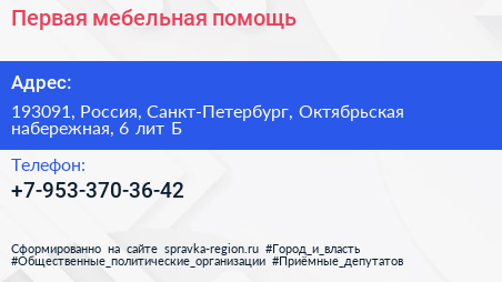 Первая мебельная помощь по адресу 193091, Россия, Санкт-Петербург, Октябрьская набережная, 6 лит Б в дальнейшем Организация, размещена в следующих категориях: