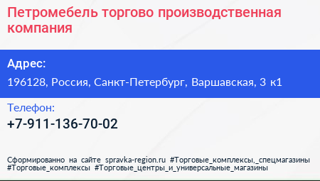Петромебель, торгово-производственная компания по адресу 196128, Россия, Санкт-Петербург, Варшавская, 3 к1 в дальнейшем Организация, размещена в следующих категориях: