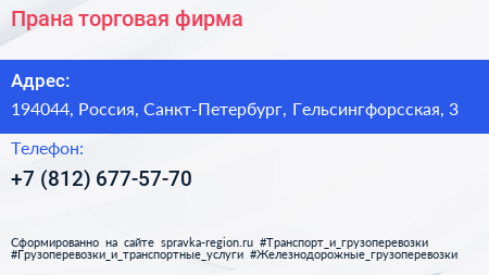 Прана, торговая фирма по адресу 194044, Россия, Санкт-Петербург, Гельсингфорсская, 3 в дальнейшем Организация, размещена в следующих категориях: