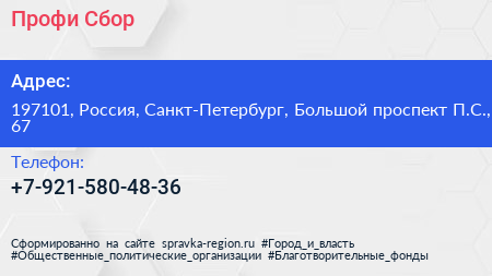 Профи Сбор по адресу 197101, Россия, Санкт-Петербург, Большой проспект П.С., 67 в дальнейшем Организация, размещена в следующих категориях: