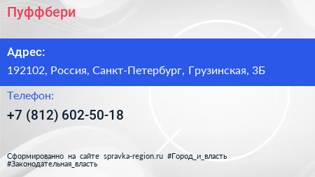Пуффбери по адресу 192102, Россия, Санкт-Петербург, Грузинская, 3Б в дальнейшем Организация, размещена в следующих категориях: