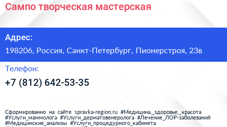 Сампо, творческая мастерская по адресу 198206, Россия, Санкт-Петербург, Пионерстроя, 23в в дальнейшем Организация, размещена в следующих категориях: