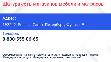 Шатура, сеть магазинов мебели и матрасов по адресу 192242, Россия, Санкт-Петербург, Фучика, 9 в дальнейшем Организация, размещена в следующих категориях: