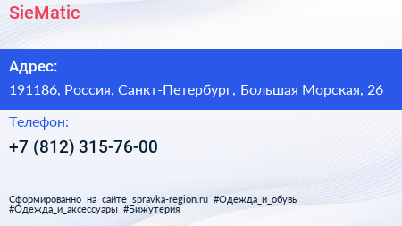 SieMatic по адресу 191186, Россия, Санкт-Петербург, Большая Морская, 26 в дальнейшем Организация, размещена в следующих категориях: