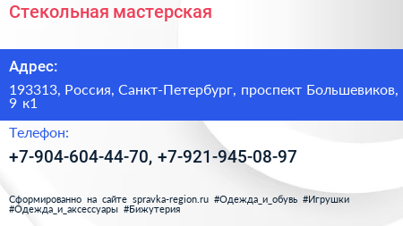 Стекольная мастерская по адресу 193313, Россия, Санкт-Петербург, проспект Большевиков, 9 к1 в дальнейшем Организация, размещена в следующих категориях: