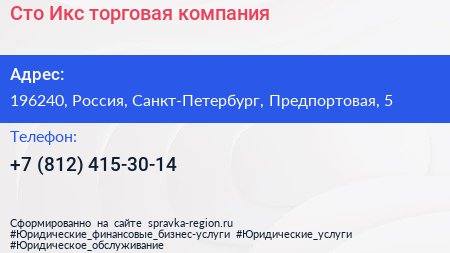Сто Икс, торговая компания по адресу 196240, Россия, Санкт-Петербург, Предпортовая, 5 в дальнейшем Организация, размещена в следующих категориях: