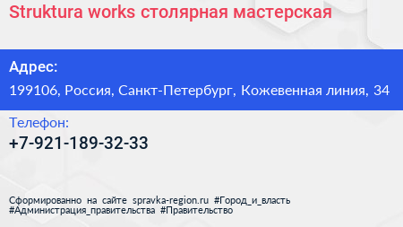 Struktura works, столярная мастерская по адресу 199106, Россия, Санкт-Петербург, Кожевенная линия, 34 в дальнейшем Организация, размещена в следующих категориях: