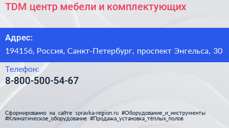 TDM, центр мебели и комплектующих по адресу 194156, Россия, Санкт-Петербург, проспект Энгельса, 30 в дальнейшем Организация, размещена в следующих категориях: