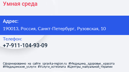 Умная среда по адресу 190013, Россия, Санкт-Петербург, Рузовская, 10 в дальнейшем Организация, размещена в следующих категориях: