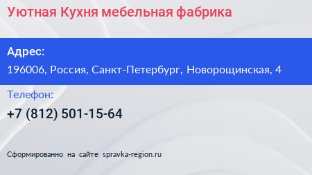Уютная Кухня, мебельная фабрика по адресу 196006, Россия, Санкт-Петербург, Новорощинская, 4 в дальнейшем Организация, размещена в следующих категориях: