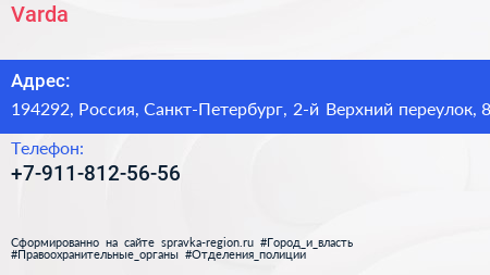 Varda по адресу 194292, Россия, Санкт-Петербург, 2-й Верхний переулок, 8 в дальнейшем Организация, размещена в следующих категориях: