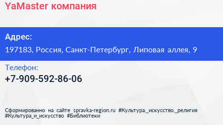 YaMaster, компания по адресу 197183, Россия, Санкт-Петербург, Липовая аллея, 9 в дальнейшем Организация, размещена в следующих категориях: