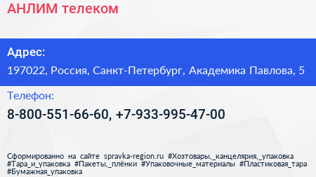 АНЛИМ телеком по адресу 197022, Россия, Санкт-Петербург, Академика Павлова, 5 в дальнейшем Организация, размещена в следующих категориях: