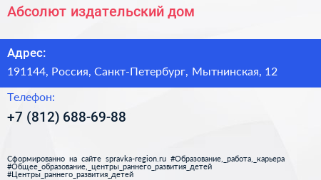 Абсолют, издательский дом по адресу 191144, Россия, Санкт-Петербург, Мытнинская, 12 в дальнейшем Организация, размещена в следующих категориях: