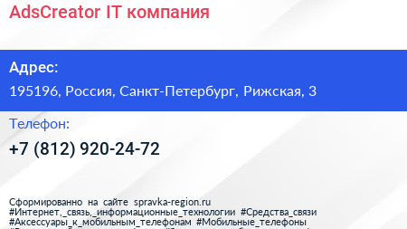 AdsCreator, IT-компания по адресу 195196, Россия, Санкт-Петербург, Рижская, 3 в дальнейшем Организация, размещена в следующих категориях: