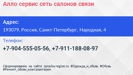 Алло сервис, сеть салонов связи по адресу 193079, Россия, Санкт-Петербург, Народная, 4 в дальнейшем Организация, размещена в следующих категориях: